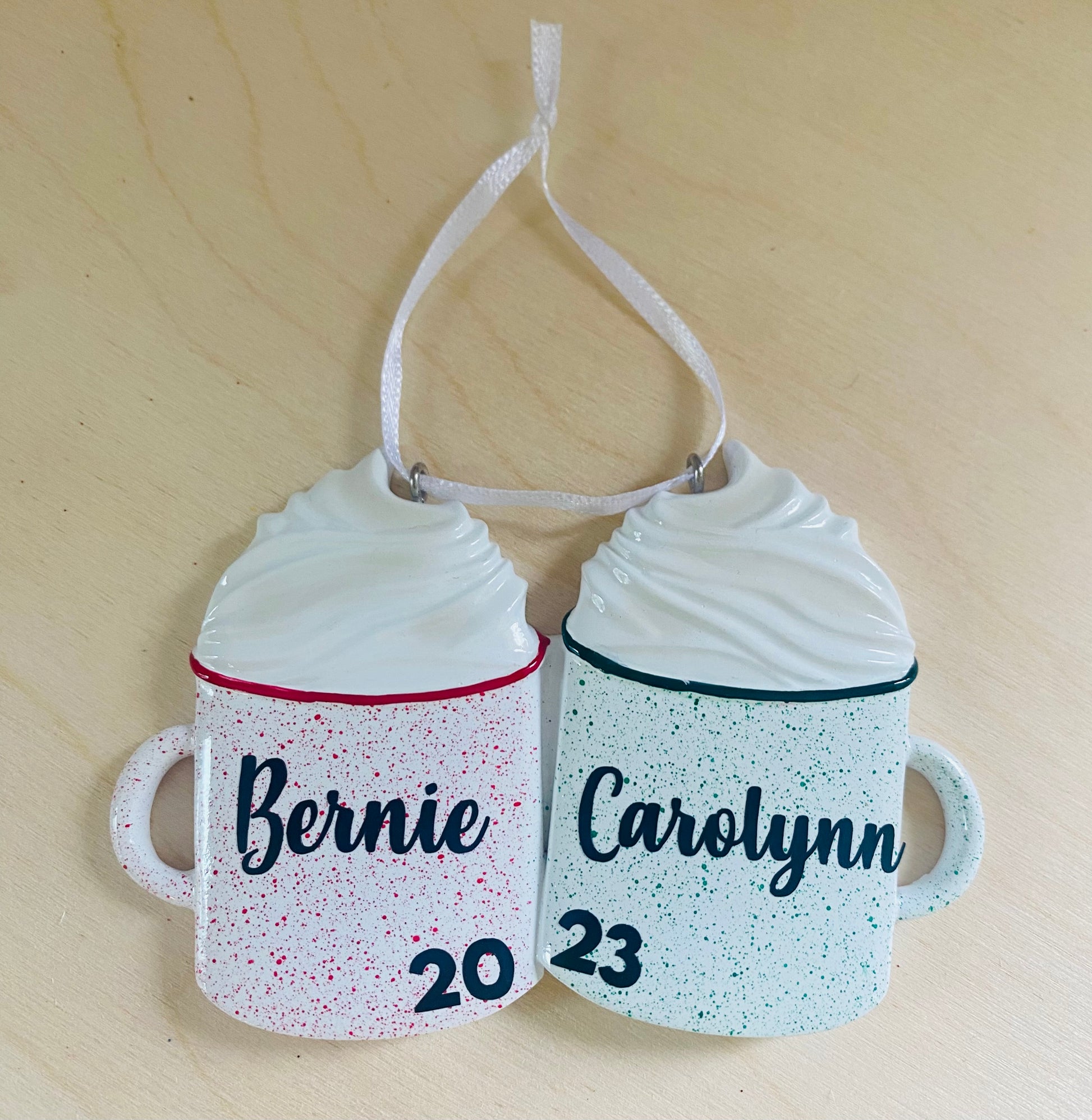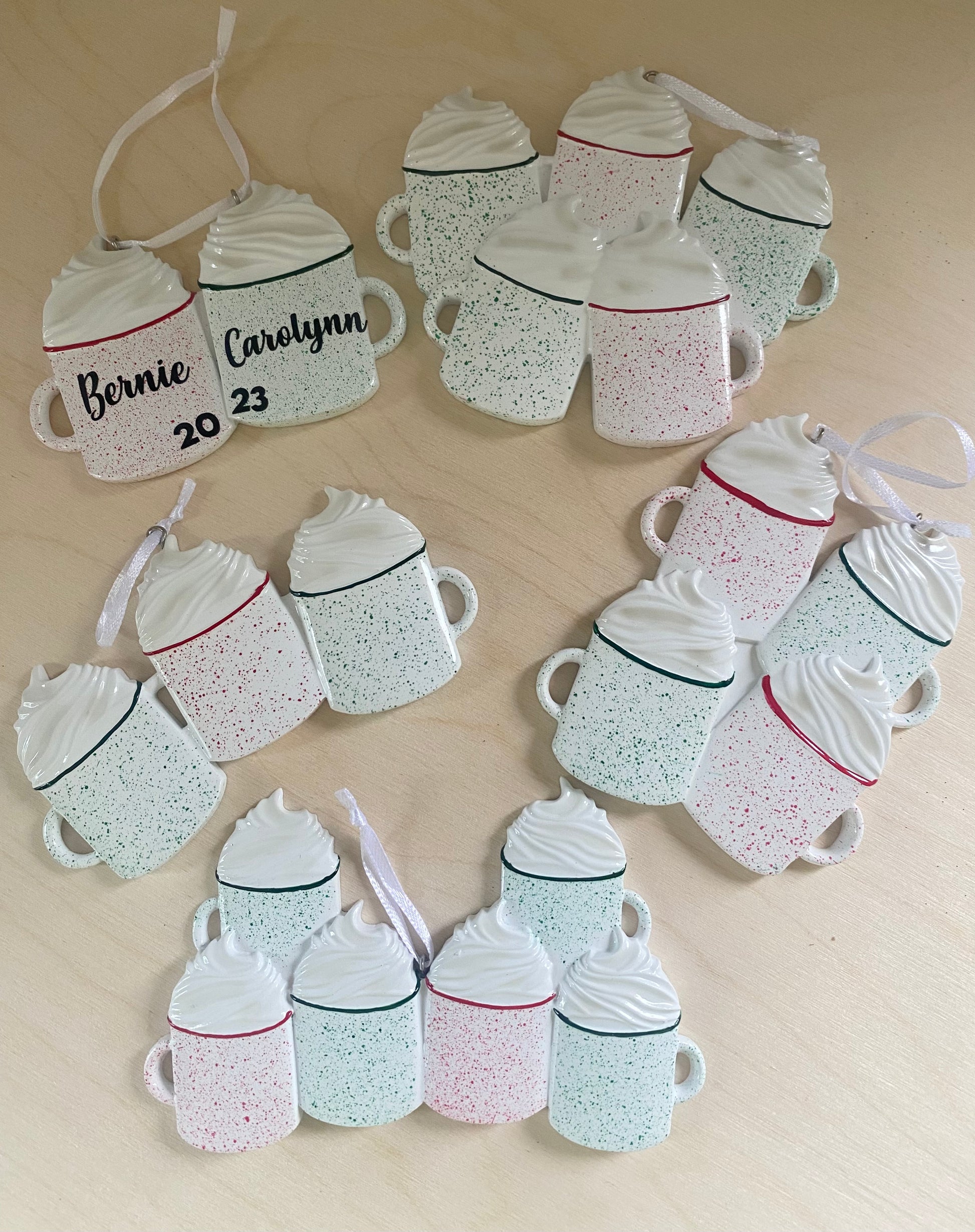 Give the gift of personalized family ornaments! Add members of the family on each hot cocoa figure. These make the perfect gift for any holiday party. Add up to 6 family members. Made of ceramic and vinyl lettering.