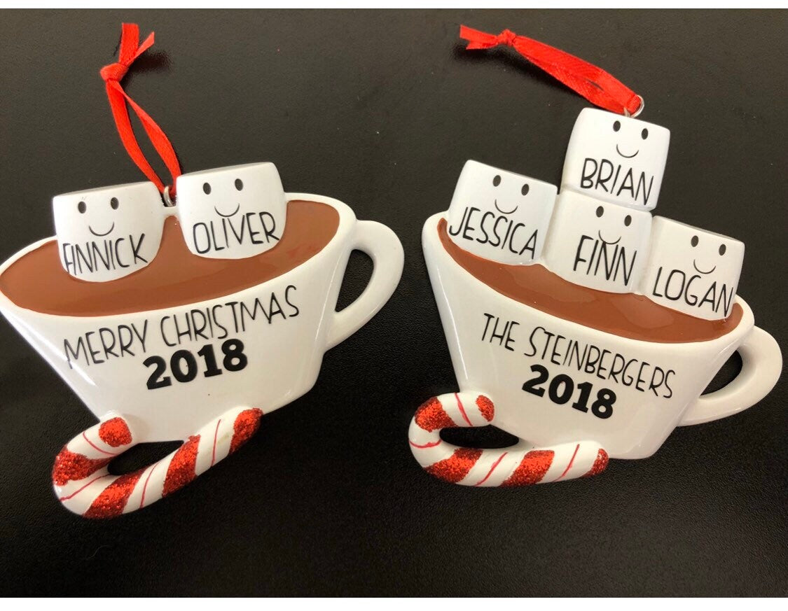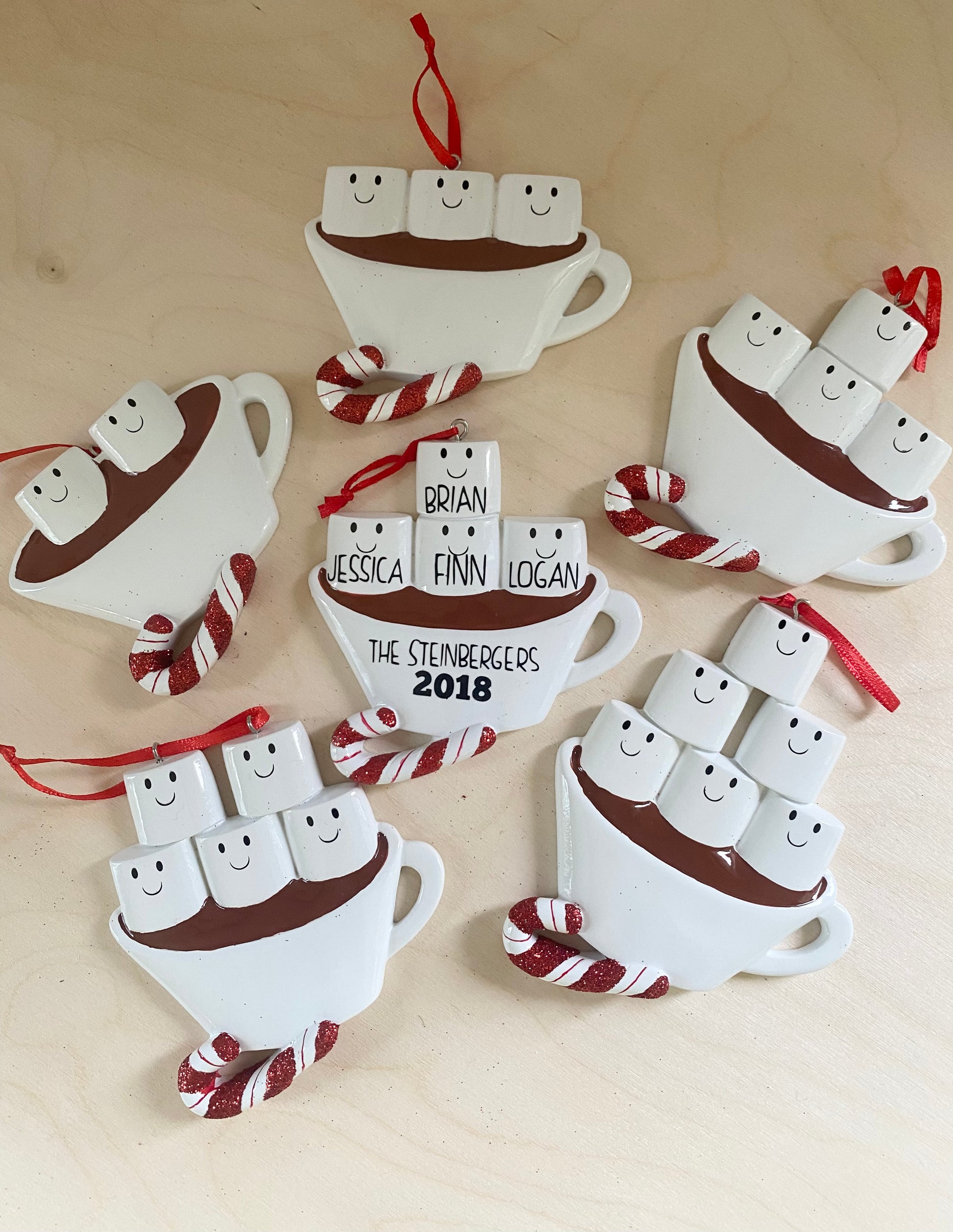 Give the gift of personalized family ornaments! Add any family name along with the members of the family on each marshmallow figure. These make the perfect gift for any holiday party. Add up to 6 family members. Made of ceramic and vinyl lettering.