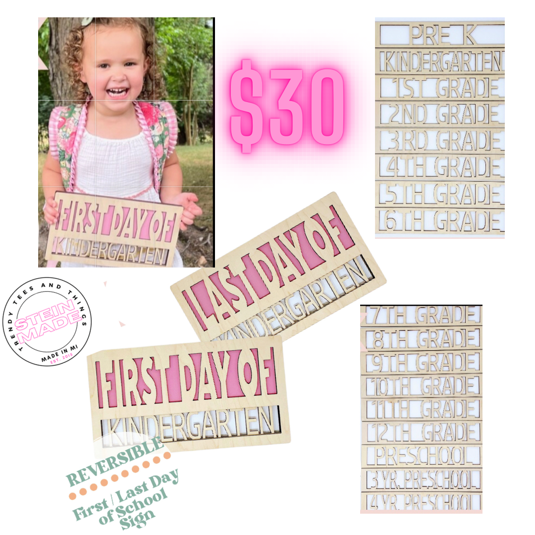 Now making wooden signs! Introducing our reversible changeout school sign for all your first and last day of school pics! This sign includes grades Preschool 3-12th grade that slides in and out to change out every year. First Day of school option on the front and Last day of school option on the back. All you have to do is pick your custom color for the background from the drop down menu to order! All signs are hand painted and laser cut by us in house. They took about 7-10 days to create and then 3 days to ship to your door!